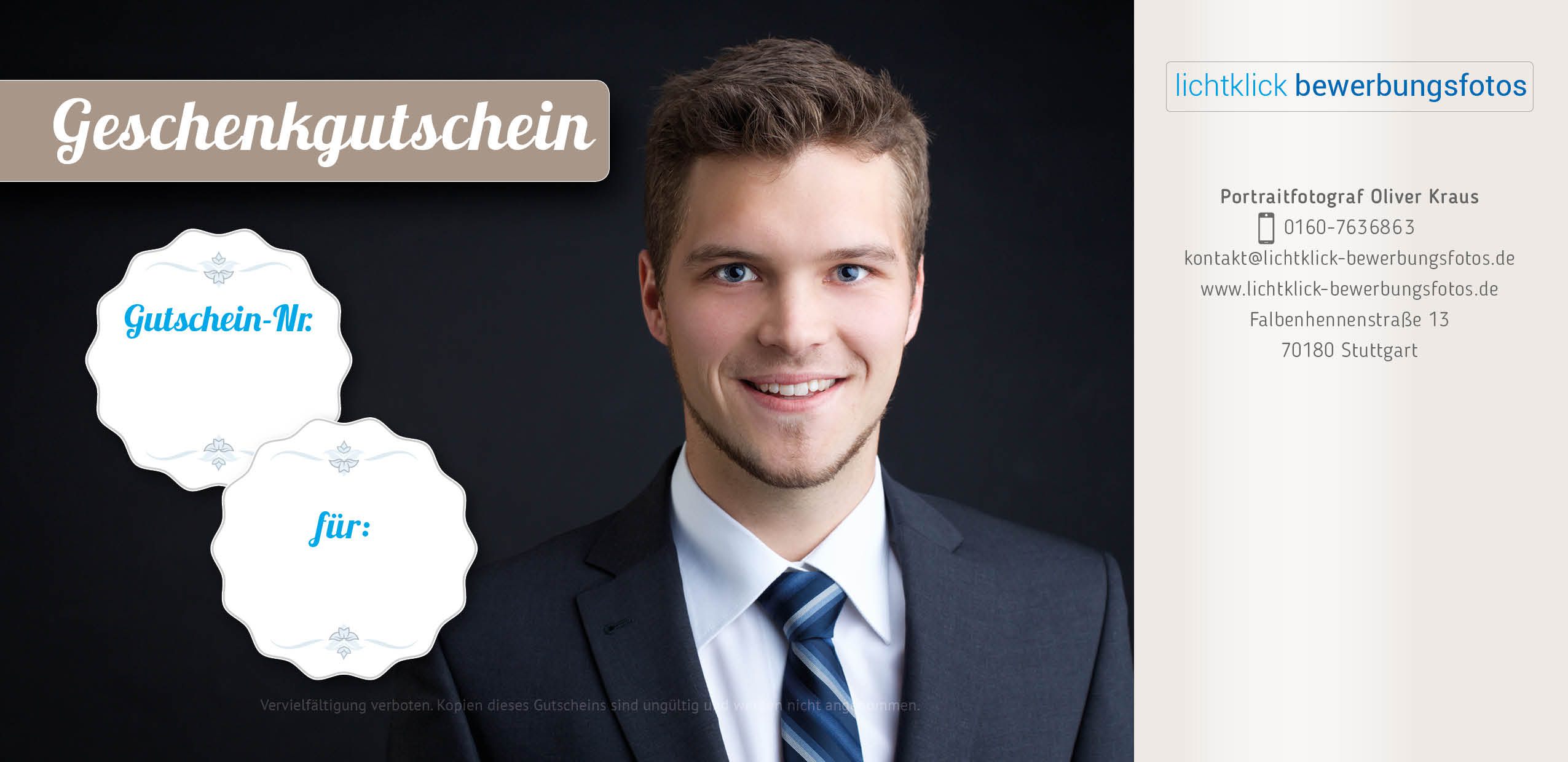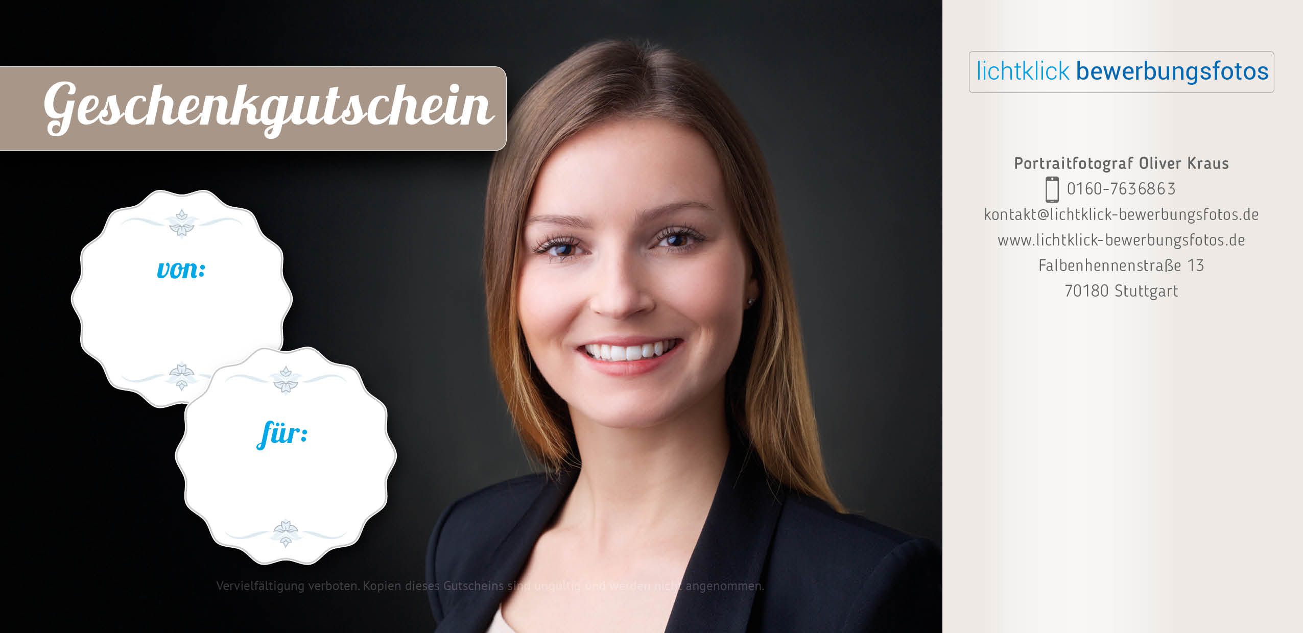 Sie suchen nach einem passenden Geschenk? Dann verschenken Sie doch einfach ein Bewerbungs-Shooting. Anlässe gibt es genug: Das bestandene Abi oder Examen, der erfolgreiche Abschluss der Ausbildung oder einfach zum Geburtstag. Gerne senden wir Ihnen einen Gutschein zu! Entweder auf dem Postweg oder als PDF-Datei per Mail. Auf Wunsch auch personalisiert.