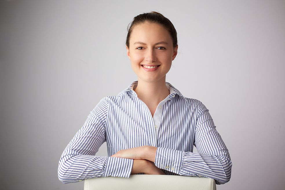 Eine Frisur, die Ihre natürliche Haarstruktur berücksichtigt, wirkt immer am besten. Sie haben von Natur aus lockige Haare? Dann lassen Sie sie so. Sie tragen Ihr Haare lang? Dann legen Sie sie nach hinten (auf beiden Seiten oder nur auf einer Seite) oder binden Sie sie zu einem Zopf. Generell wirkt eine dezente Frisur vor allem bei jungen Frauen etwas "reifer" und "erfahrener". Was am besten aussieht, können wir gerne beim Shooting ausprobieren und verschiedene Varianten fotografieren.